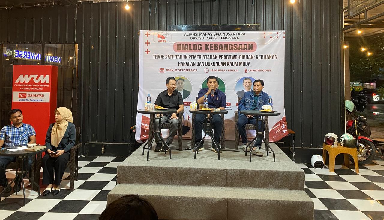 HarmoniSultra.com, Sulawesi Tenggara – Dalam rangka memperingati satu tahun pemerintahan Presiden Prabowo Subianto dan Wakil Presiden Gibran Rakabuming Raka, Dewan Pimpinan Wilayah (DPW) Aliansi Mahasiswa Nusantara (AMAN) Sulawesi Tenggara (Sultra) menggelar diskusi publik bertajuk “Satu Tahun Pemerintahan Prabowo–Gibran: Kebijakan, Harapan, dan Dukungan Kaum Muda” Senin (27/11/2025) di Universe Coffe, Kendari.